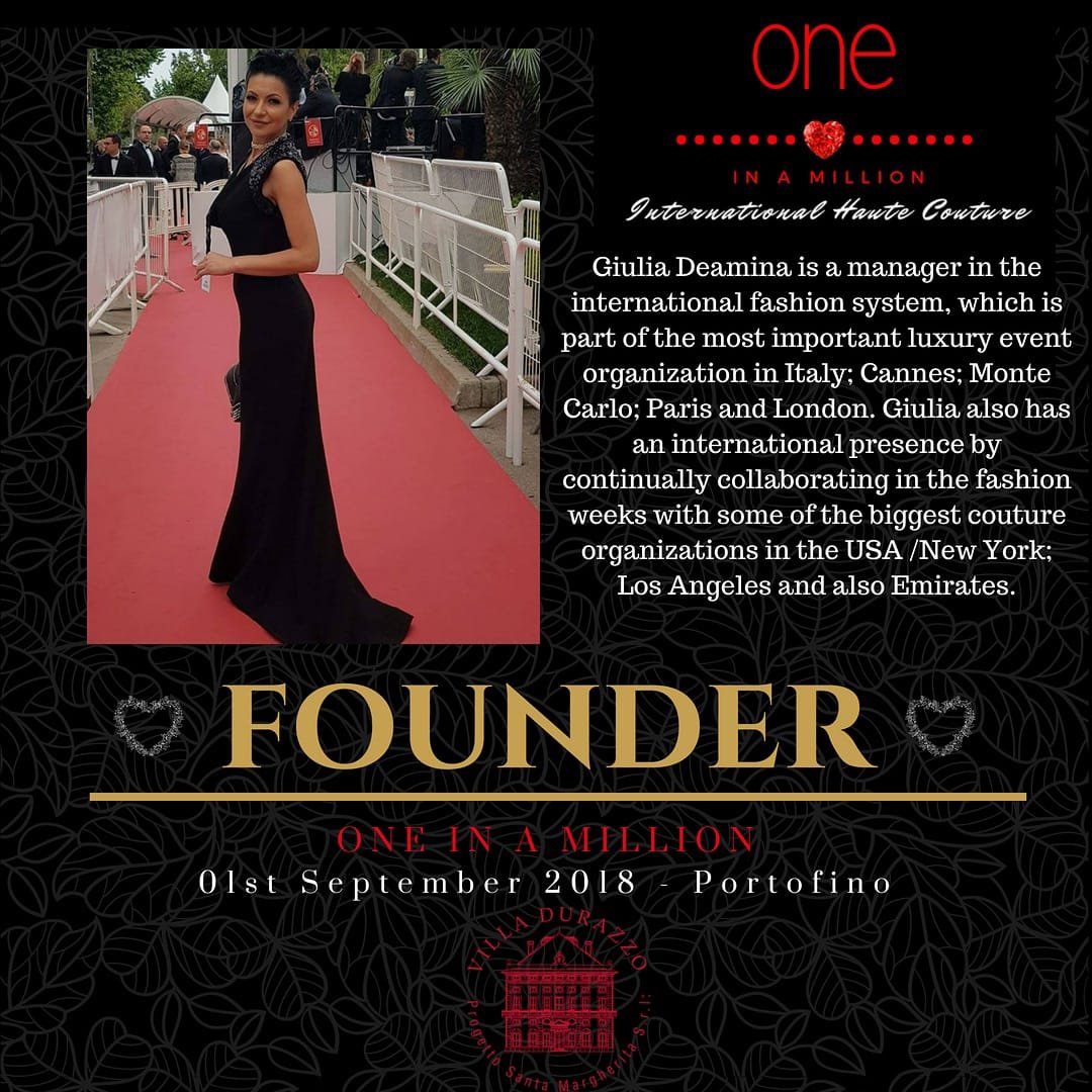 “One in a million international haute couture”, founded by Giulia Deamina Production of Giulia Deamina, international manager in the fashion system, often in the most luxurious international jet-set organizations (Paris, Cannes, Montecarlo, London, Dubai and New York) as well publisher of the homonymous magazine of luxury and fashion DEAMINA MAGAZINE.